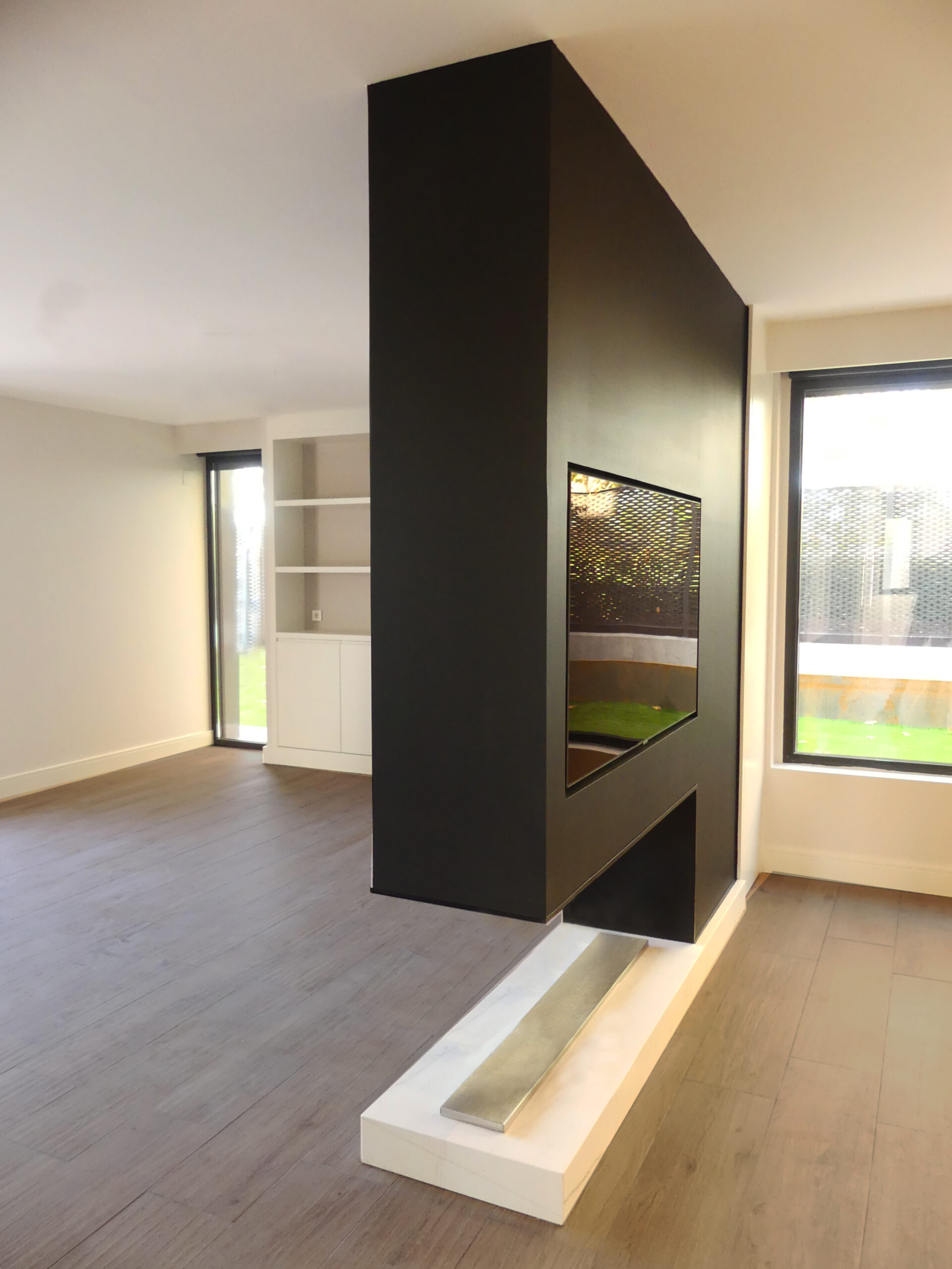 Proyecto, dirección y ejecución de la obra de reforma integral de vivienda de 298 m² en la calle Condesa de Trifaldi, en el barrio de Tres Olivos. Leire y Fernando, los propietarios y además muy amigos, decidieron dar un cambio de imagen a la vivienda. En su estado original, la casa estaba compartimentada, con los espacios muy definidos. Decidimos tirar los tabiques abajo para dar mas sensación de amplitud, agrandamos bastante la cocina, con una gran isla central, punto neurálgico de la casa. Se crean tabiques de vidrio, muebles de cocina como separación de espacios, y una gran chimenea volada. Todos los espacios se mezclan de alguna manera, y conviven sin invadirse unos de otros. La planta primera, la de dormitorios, se mantuvo casi intacta, salvo el dormitorio principal, que se agrandó partiendo de dos dormitorios, creando un gran vestidor de acabados de madera y un pequeño despacho para trabajar. Hicimos una piscina de lujo en el jardín, con cobertor de madera para proteger del frío y nadador de acero en su lado mas corto. En el sótano un cine-bar donde, además de los propietarios, disfrutamos todos los amigos cuando hay partido.